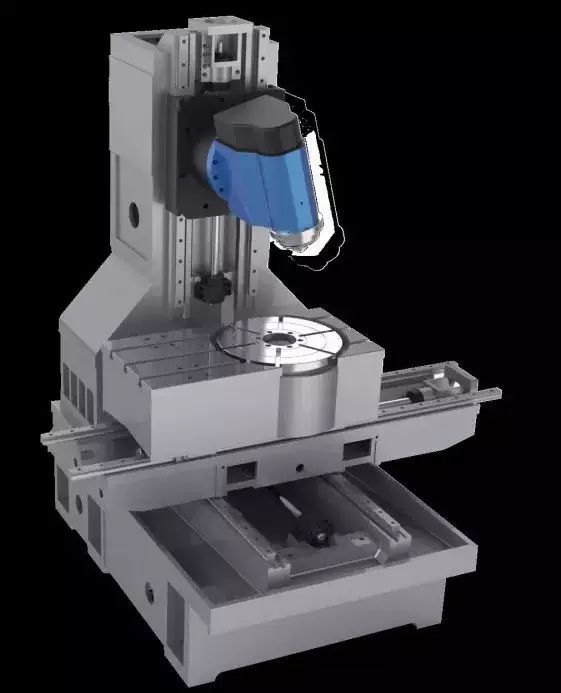 這種機(jī)型的轉(zhuǎn)臺(tái)可以做的很大,承載大重量的模具,因?yàn)楣ぜ辉赬Y平面做直線運(yùn)動(dòng)和轉(zhuǎn)動(dòng),重力對(duì)其沒(méi)有影響。但轉(zhuǎn)臺(tái)C和B擺銑頭的聯(lián)動(dòng),加上XYZ,它又是一個(gè)真五軸機(jī),什么復(fù)雜曲面都能加工。另外旋轉(zhuǎn)工作臺(tái)只有一個(gè)C軸,制造成本跟搖籃比大幅度降低,無(wú)論是從功能,還是從力學(xué)結(jié)構(gòu)、還是從精度,從制造難度上來(lái)考量,這種五軸機(jī)都應(yīng)該是加工模具的完美機(jī)型。